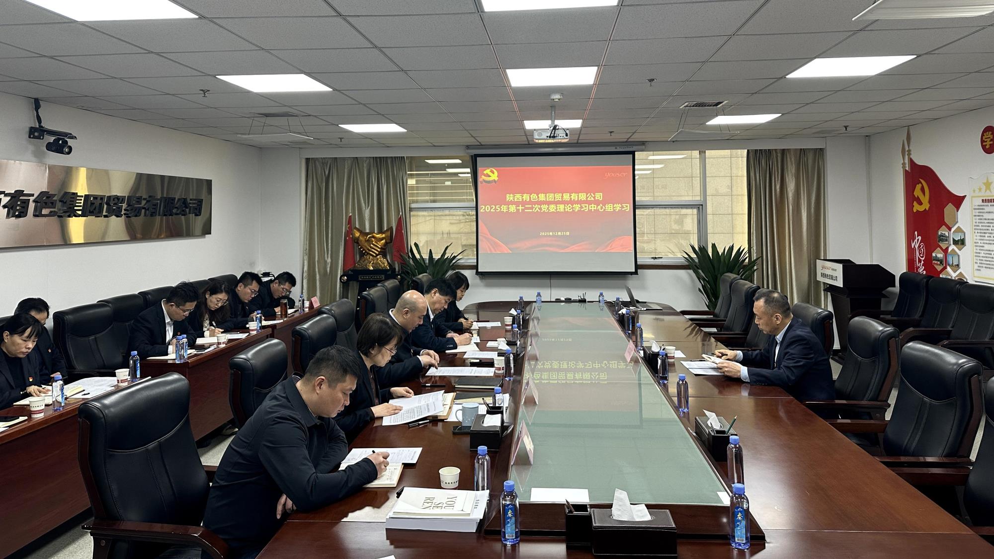 12月25日,贸易公司召开2025年党委理论学习中心组第12次学习会议。陕西有色金属集团党委委员、副总经理赵黎明到会旁听督导,贸易公司党委书记石正军主持会议。