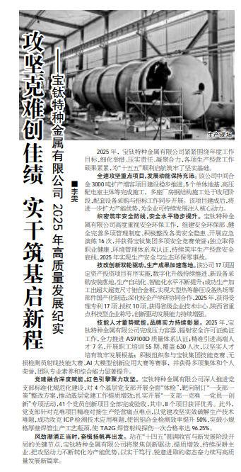 2025年,宝钛特种金属有限公司紧紧围绕年度工作目标,细化举措、压实责任、凝聚合力,各项生产经营工作硕果累累,为“十五五”顺利启航筑牢了坚实基础。